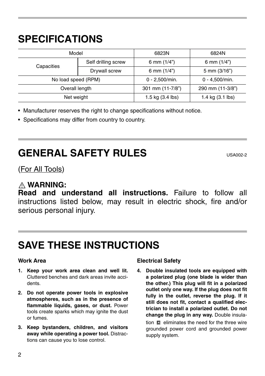 For your personal safety, READ and UNDERSTAND before using. SAVE THESE INSTRUCTIONS FOR FUTURE REFERENCE. SPECIFICATIONS Model Capacities 6823N 6824N Self drilling screw 6 mm (1/4”) 6 mm (1/4”) Drywall screw 6 mm (1/4”) 5 mm (3/16”) No load speed (RPM)
