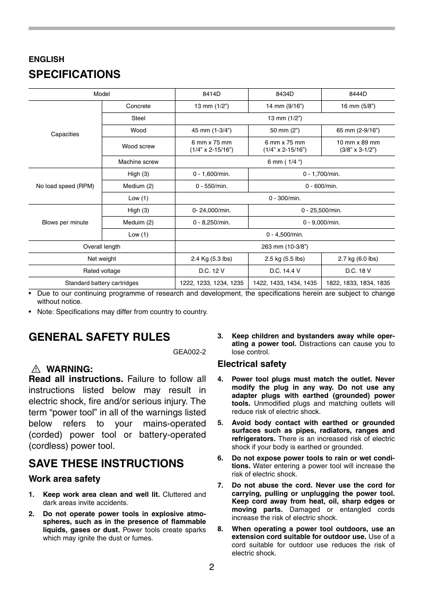 (2) Avoid storing battery cartridge in a container with other metal objects such as nails, coins, etc. (3) Do not expose battery cartridge to water or rain. A battery short can cause a large current flow, overheating, possible burns and even a breakdown.