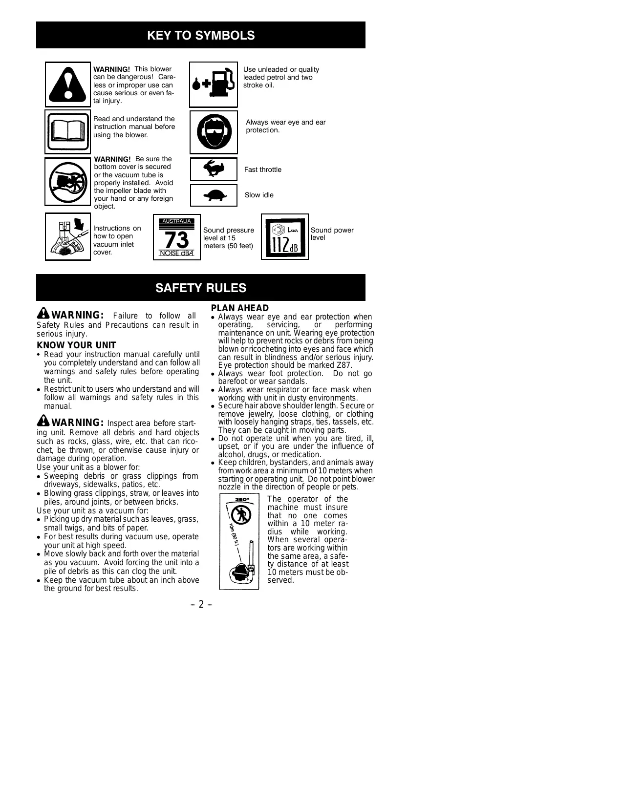 Use unleaded or quality leaded petrol and wo stroke oil. Read and understand the instruction manual before using the blower. Always wear eye and ear WARNING! Be sure the bottom cover is secured or the vacuum tube is proper installed. Avoid the impeller blade with your hand or any foreign object. protection. 79 Fast throttle Æ | scie Instructions on how to open vacuum inlet cover. *-1@ DB SAFETY RULES A WARNING: Faiure to follow all Safety Rules and Precautions can result in serious injury.