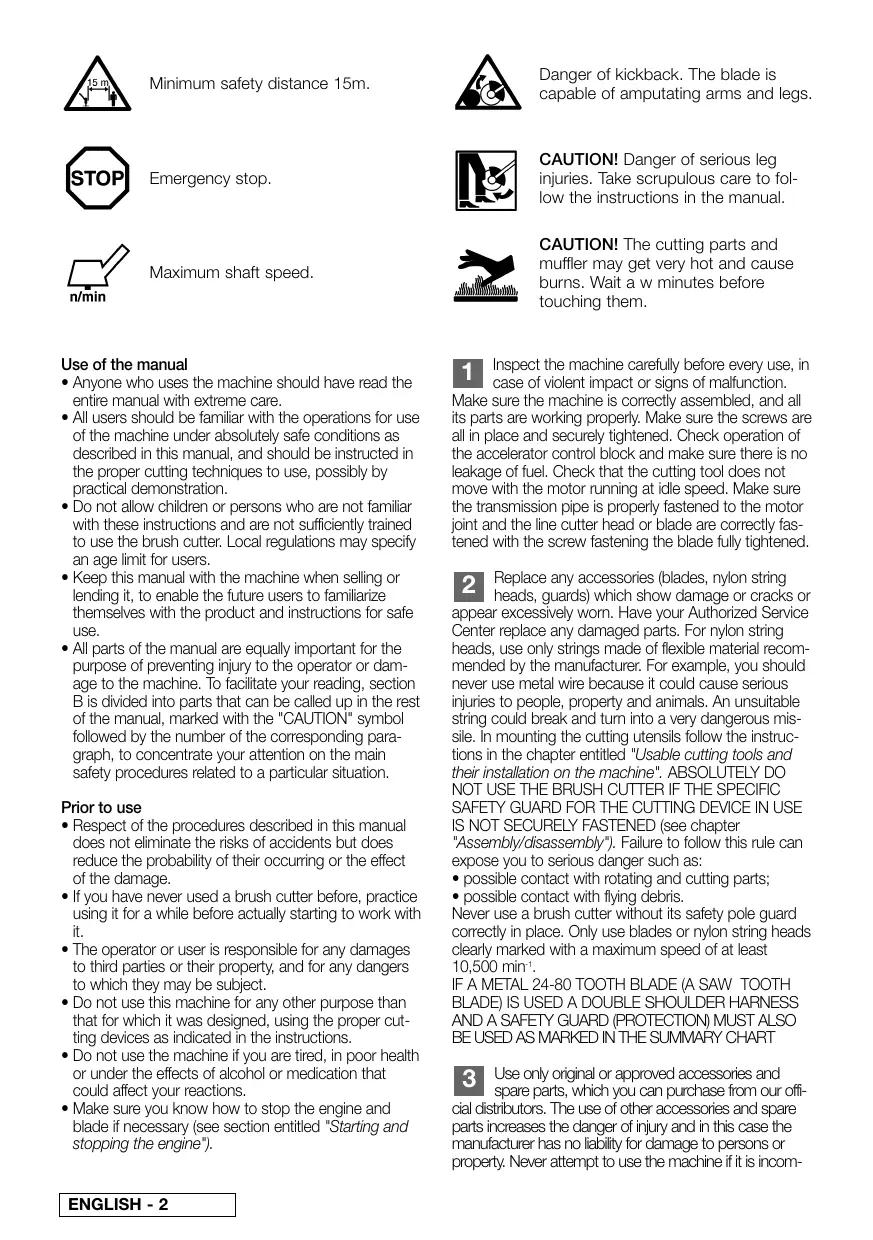 2 Replace any accessories (blades, nylon string heads, guards) which show damage or cracks or appear excessively worn. Have your Authorized Service Center replace any damaged parts. For nylon string heads, use only strings made of flexible material recommended by the manufacturer. For example, you should never use metal wire because it could cause serious injuries to people, property and animals. An unsuitable string could break and turn into a very dangerous missile. In mounting the cutting utensils follow the instructions in the chapter entitled "Usable cutting tools and their installation on the machine". ABSOLUTELY DO NOT USE THE BRUSH CUTTER IF THE SPECIFIC SAFETY GUARD FOR THE CUTTING DEVICE IN USE IS NOT SECURELY FASTENED (see chapter "Assembly/disassembly"). Failure to follow this rule can expose you to serious danger such as: