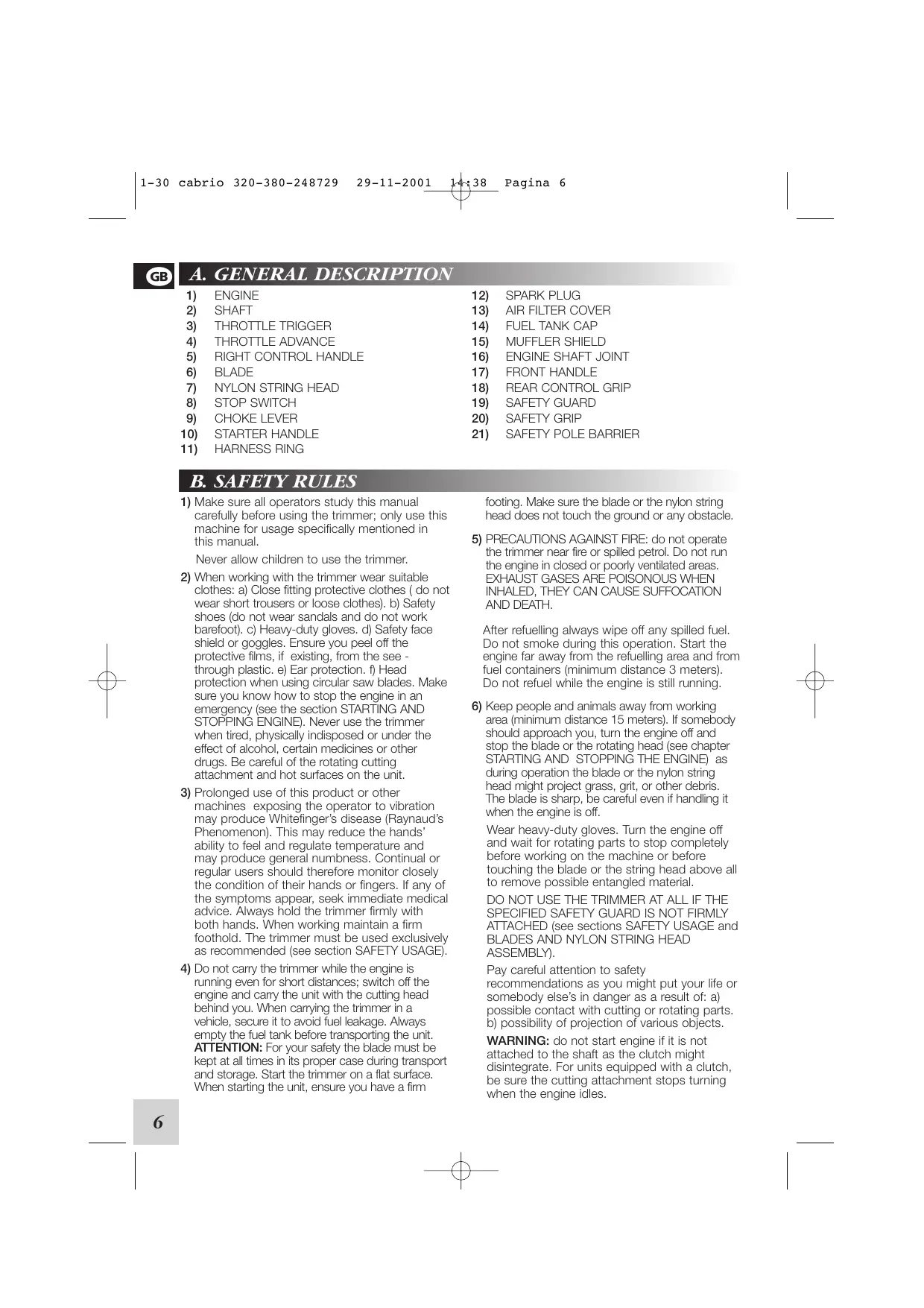 1-30 cabrio 320-380-248729 29-11-2001 F 8 Pagina 7 C. SAFETY USAGE. This product must be held to the right of the operators body. This will ensure exhaust fumes are directed away from the operator and will not be obstructed by the operators clothing. If you have not used a trimmer before, spend some time in becoming famillar with the controls and method of usage before operation. Check the machine carefully before using it. Make sure that there are no loosened screws, damaged parts or fuel leakages. Replace damaged or excessively worn accessories (blades, string heads, quards) Ensure all maintenance or repair work is carried out by an authorised service center. NB. In order to maintain performance and safety, be sure to use original spare parts and accessories. Avoid using the trimmer over excessively long periods of time. Excessive amounts of vibration can be harmful.