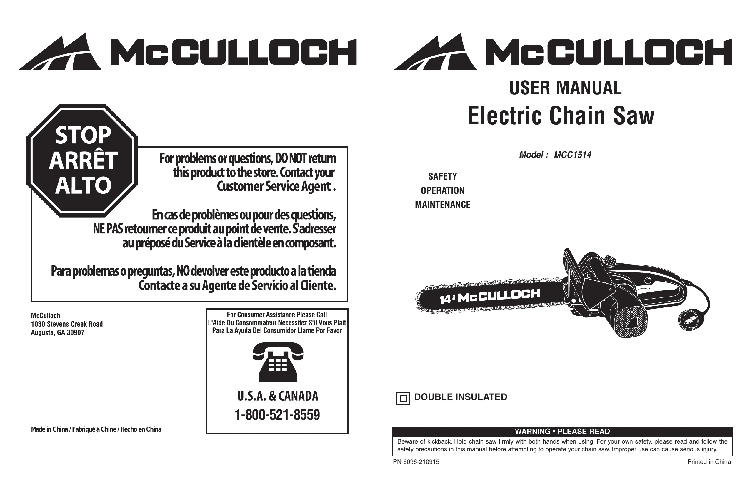 Download the instructions for your Electric chainsaw in PDF format for free! Find your manual MCC1514 - MCCULLOCH and take your electronic device back in hand. On this page are published all the documents necessary for the use of your device. MCC1514 by MCCULLOCH.