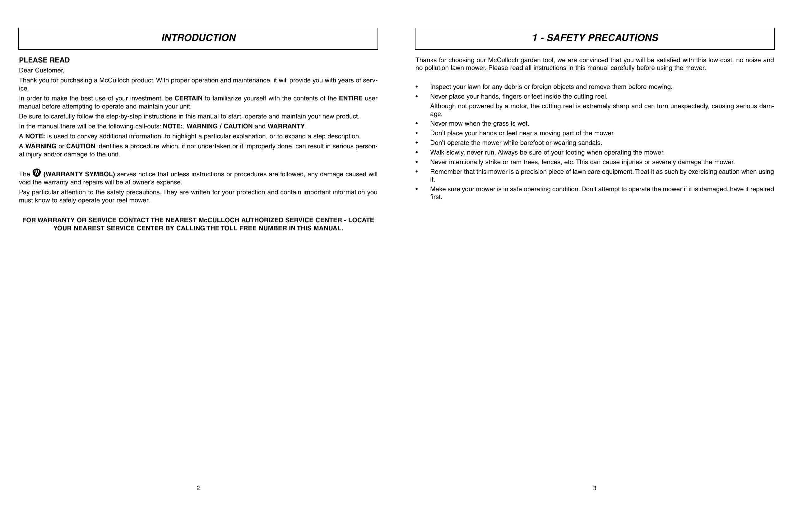 FOR WARRANTY OR SERVICE CONTACT THE NEAREST McCULLOCH AUTHORIZATION SERVICE CENTER - LOCATE YOUR NEAREST SERVICE CENTER BY CALLING THE TOLL FREE NUMBER IN THIS MANUAL.