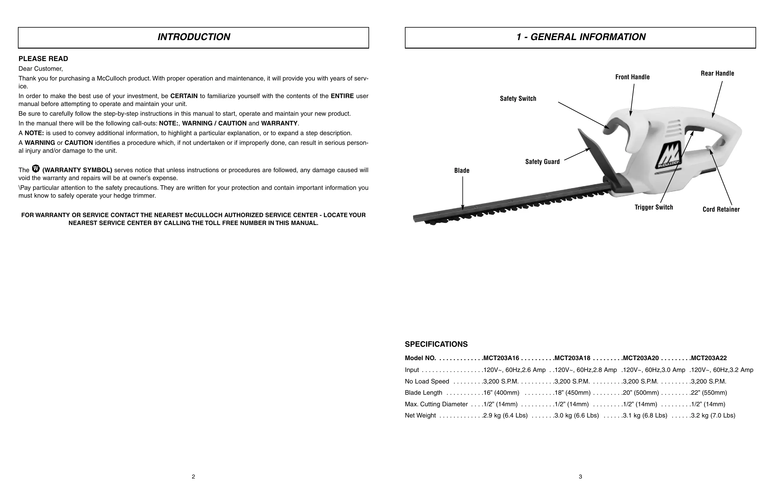 - PLEASE READ Dear Customer, Front Handle Thank you for purchasing a McCulloch product. With proper operation and maintenance, it will provide you with years of service. In order to make the best use of your investment, be CERTAIN to familiarize yourself with the contents of the ENTIRE user manual before attempting to operate and maintain your unit. Rear Handle Safety Switch Be sure to carefully follow the step-by-step instructions in this manual to start, operate and maintain your new product. In the manual there will be the following call-outs: NOTE:, WARNING / CAUTION and WARRANTY. A NOTE: is used to convey additional information, to highlight a particular explanation, or to expand a step description. A WARNING or CAUTION identifies a procedure which, if not undertaken or if improperly done, can result in serious personal injury and/or damage to the unit. Safety Guard (WARRANTY SYMBOL) serves notice that unless instructions or procedures are followed, any damage caused will The void the warranty and repairs will be at owner’s expense. Blade \Pay particular attention to the safety precautions. They are written for your protection and contain important information you must know to safely operate your hedge trimmer. Trigger Switch Cord Retainer FOR WARRANTY OR SERVICE CONTACT THE NEAREST McCULLOCH AUTHORIZED SERVICE CENTER - LOCATE YOUR NEAREST SERVICE CENTER BY CALLING THE TOLL FREE NUMBER IN THIS MANUAL. SPECIFICATIONS Model NO MCT203A16 MCT203A18 MCT203A20