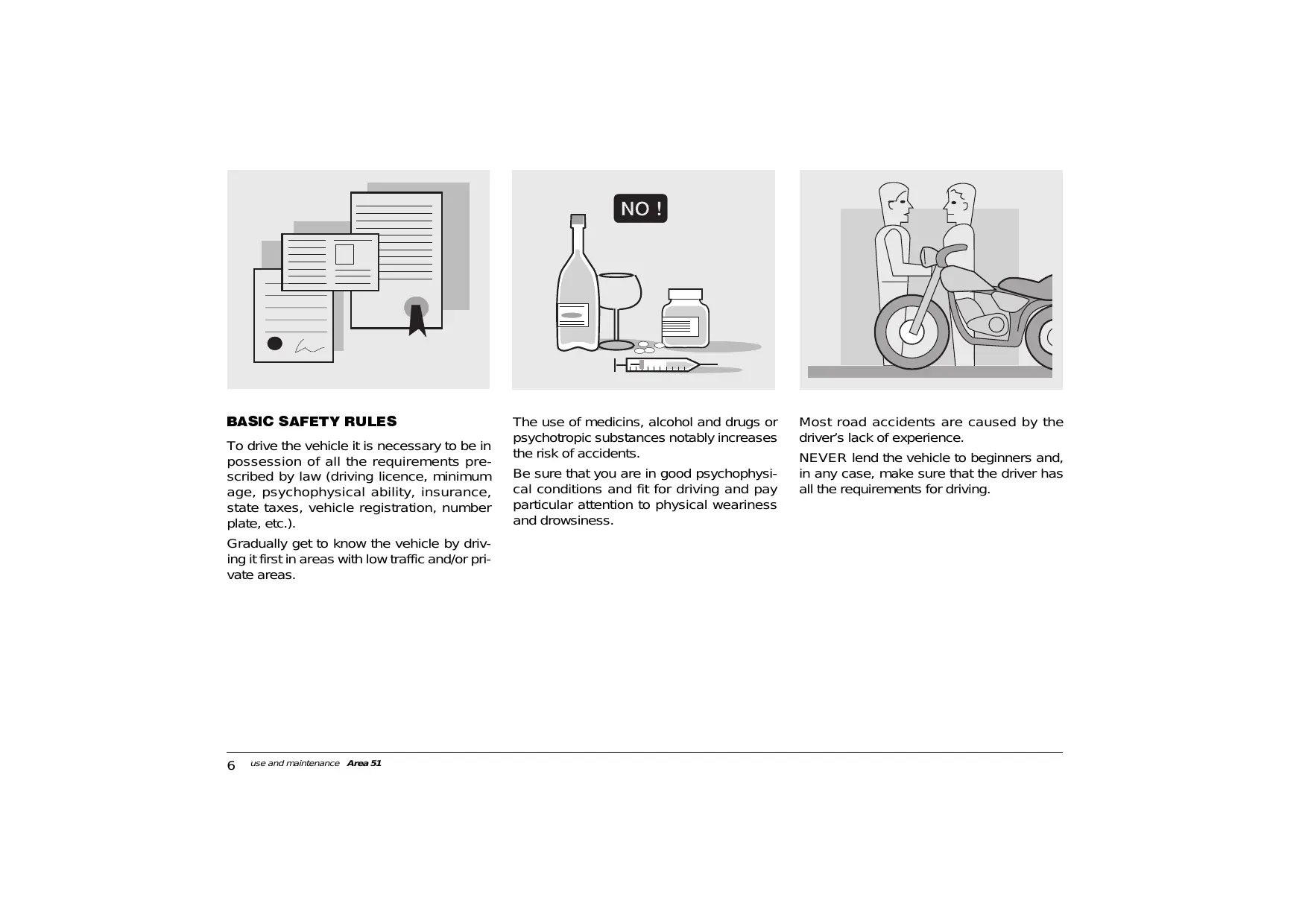 BASIC SAFETY RULES To drive the vehicle it is necessary to be in possession of all the requirements pre- scribed by law (driving licence, minimum age, psychophysical ability, insurance, state taxes, vehicle registration, number plate, etc.).