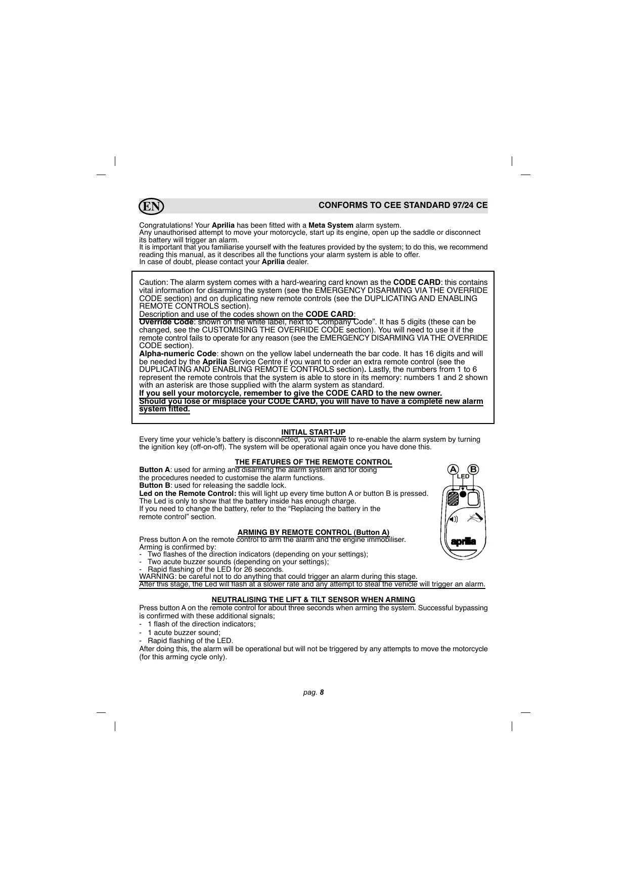EN CONFORMS TO CEE STANDARD 97/24 CE Congratulations! Your Aprilia has been fitted with a Meta System alarm system. Any unauthorised attempt to move your motorcycle, start up its engine, open up the saddle or disconnect its battery will trigger an alarm. It is important that you familiarise yourself with the features provided by the system; to do this, we recommend reading this manual, as it describes all the functions your alarm system is able to offer. In case of doubt, please contact your Aprilia dealer.