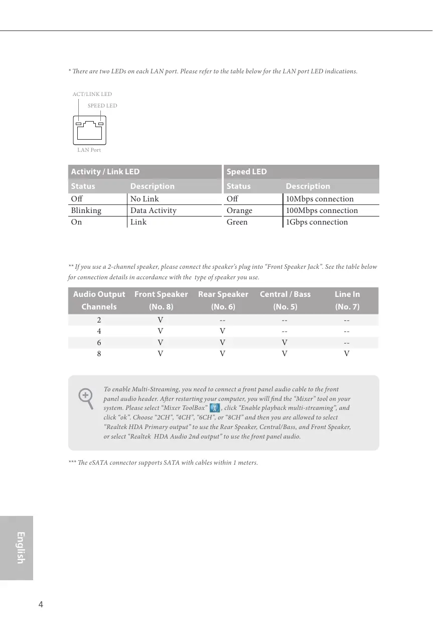 , click “Enable playback multi-streaming”, and click “ok”. Choose “2CH”, “4CH”, “6CH”, or “8CH” and then you are allowed to select “Realtek HDA Primary output” to use the Rear Speaker, Central/Bass, and Front Speaker, or select “Realtek HDA Audio 2nd output” to use the front panel audio.