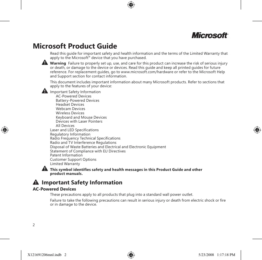 Microsoft Microsoft Product Guide Read this guide for important safety and health information and the terms of the Limited Warranty that apply to the Microsoft® device that you have purchased Warning Fallure to proper set up, use, and care for this product can increase the risk of serious injury er death, or damage to the device or devices. Read this guide and keep all printed guides for future reference. For replacement guides, go to www microsoft. com/hardware or refer to the Microsoft Help and Support section for contact information. This document includes important information about many Microsoft products. Refer to sections that apply to the features of your device: À important Safety Information ‘AC-Powered Devices Battery-Powered Devices Headset Devices Webcam Devices Wireless Devices Keyboard and Mouse Devices Devices with Laser Pointers A Devices Laser and LED Specifications Regulatory Information Radio Frequency Technical Specifications Radio and TV Interference Regulations Disposal of Waste Batteries and Electrical and Electronic Equipment Statement of Compliance with EU Directives Patent Information Customer Support Options Limited Warranty À ris symbol iden product manuals. s safety and health messages in this Product Guide and other À Important Safety Information AC-Powered Devices These précautions apply to all products that plug into a standard wall power outlet. Failure to take the following precautions can result in serious injury or death from electric shock or fire or in damage to the device. xH2tatématinds 2 & sean rise