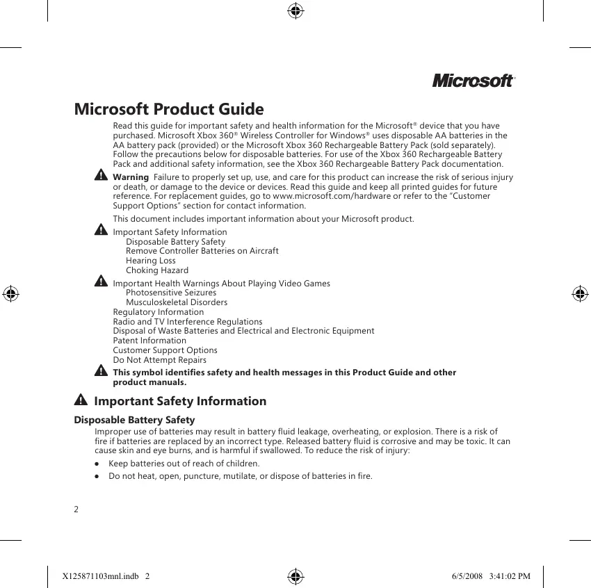 Microsoft Product Guide Read this guide for important safety and health information for the Microsoft” device that you have purchased. Microsoft Xbox 360” Wireless Controller for Windows” uses disposable AA batteries in the AAA battery pack (provided) or the Microsoft Xbox 360 Rechargeable Battery Pack (sold separately Follow the precautions below for disposable batteries, For use of the Xbox 360 Rechargeable Battery Pack and additional safety information, see the Xbox 360 Rechargeable Battery Pack documentation À warning Failure to proper set up, use, and care for this product can increase the risk of serious injury or death, or damage to the device or devices. Read this guide and keep al printed guides for future reference. For replacement guides, go to www microsofl.com/harduare or refer to the “Customer Support Options” section for contact information. This document includes important information about your Microsoft product À important Safety Information Disposable Battery Safety Remove Controller Batteries on Aircraft Hearing Loss Choking Hazard À important Health Warnings About Playing Video Games Photosensitive Seizures Musculoskeletal Disorders Regulatory Information Radio and TV Interference Regulations Disposal of Waste Batteries and Electrical and Electronic Equipment Patent Information Customer Support Options De Not Attempt Repairs À This symbol identifies safety and health messages in this Product Guide and other product manuals. À Important Safety Informati Disposable Battery Safety Improper use of batteries may result in battery fluid leakage, overheating, or explosion. There is a risk of fire if batteries are replaced by an incorrect type. Released battery fluid is corrosive and may be toxic. I can cause skin and eye burns, and is harmful if swallowed. To reduce the risk of injury: + _ Keep batteries out of reach of children. + Do not heat, open, puncture, mutilate, or dispose of batteries in fire.