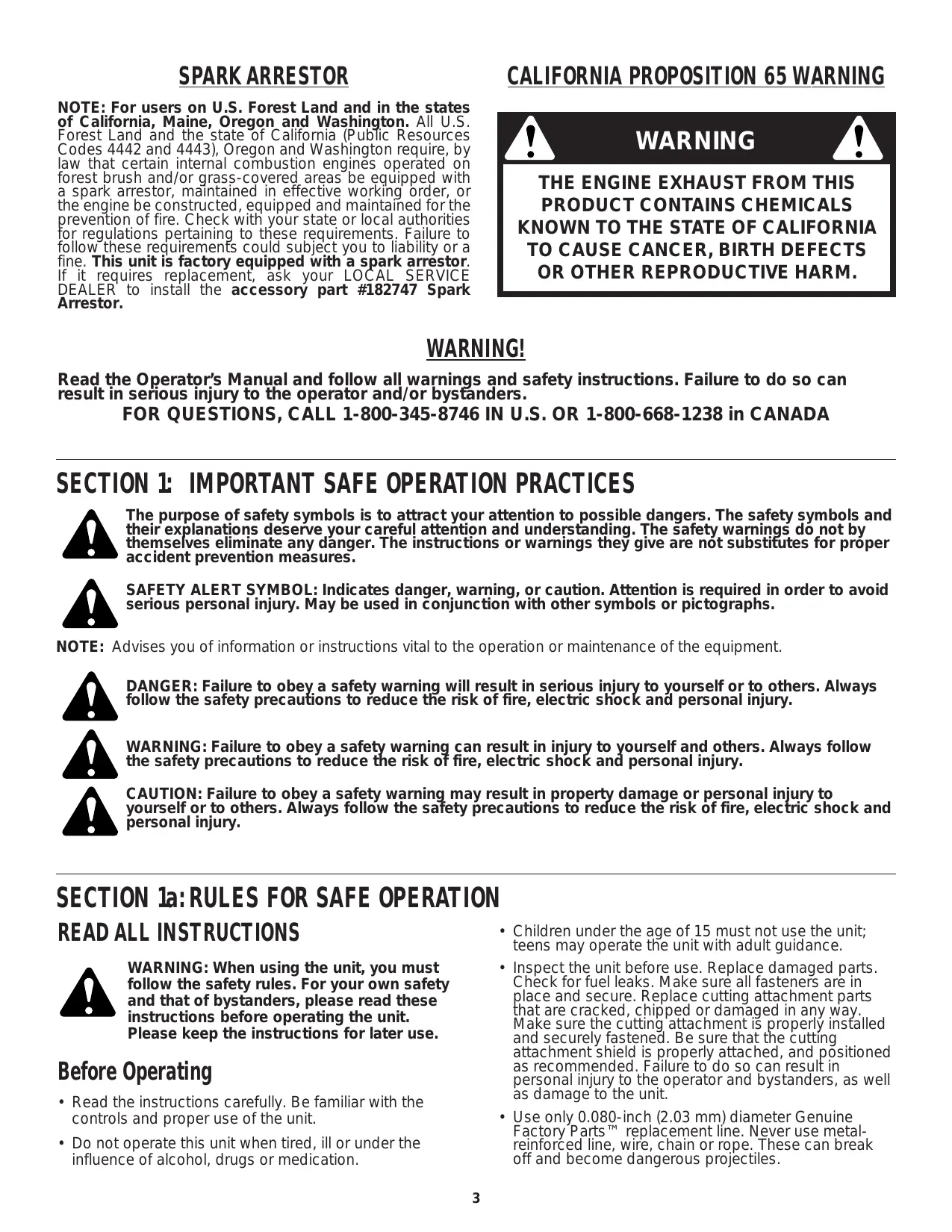 OR OTHER REPRODUCTIVE HARM. WARNING! Read the Operator’s Manual and follow all warnings and safety instructions. Failure to do so can result in serious injury to the operator and/or bystanders. FOR QUESTIONS, CALL 1-800-345-8746 IN U.S. OR 1-800-668-1238 in CANADA