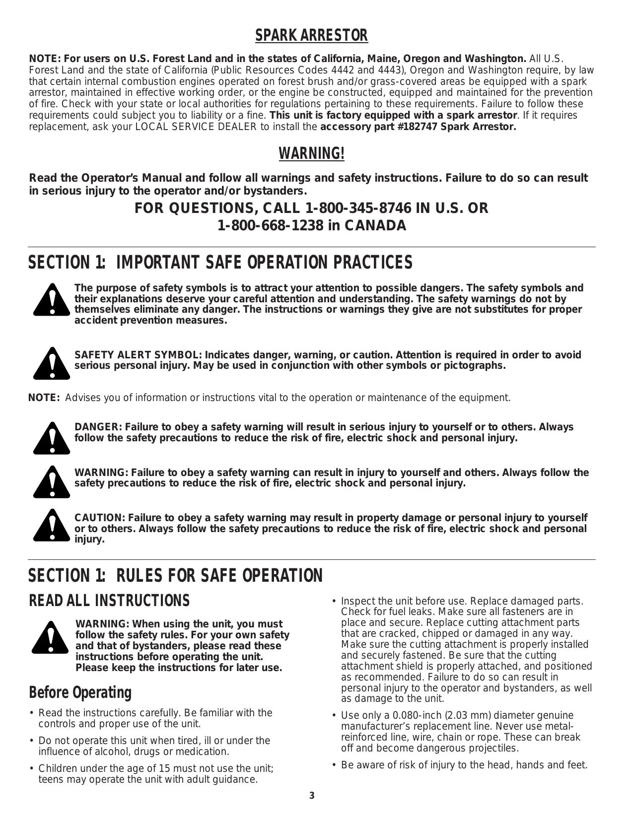 SPARK ARRESTOR NOTE: For users on U.S. Forest Land and in the states of California, Maine, Oregon and Washington. All US. Forest Land and the state of California (Public Resources Codes 4442 and 4443), Oregon and Washington require, by law that certain internal combustion engines operated on forest brush and/or grass-covered areas be equipped with a spark arrestor, maintained in effective working order, or the engine be constructed, equipped and maintained for the prevention of fire. Check with your state or local authorities for regulations pertaining to these requirements. Failure to follow these requirements could subject you to liability or a fine. This unit is factory equipped with a spark arrestor. If it requires replacement, ask your LOCAL SERVICE DEALER to install the accessory part #182747 Spark Arrestor. WARNING! Read the Operator's Manual and follow all warnings and safety instructions. Failure to do so can result in serious injury to the operator and/or bystanders. FOR QUESTIONS, CALL 1-800-345-8746 IN US. OR 1-800-668-1238 in CANADA