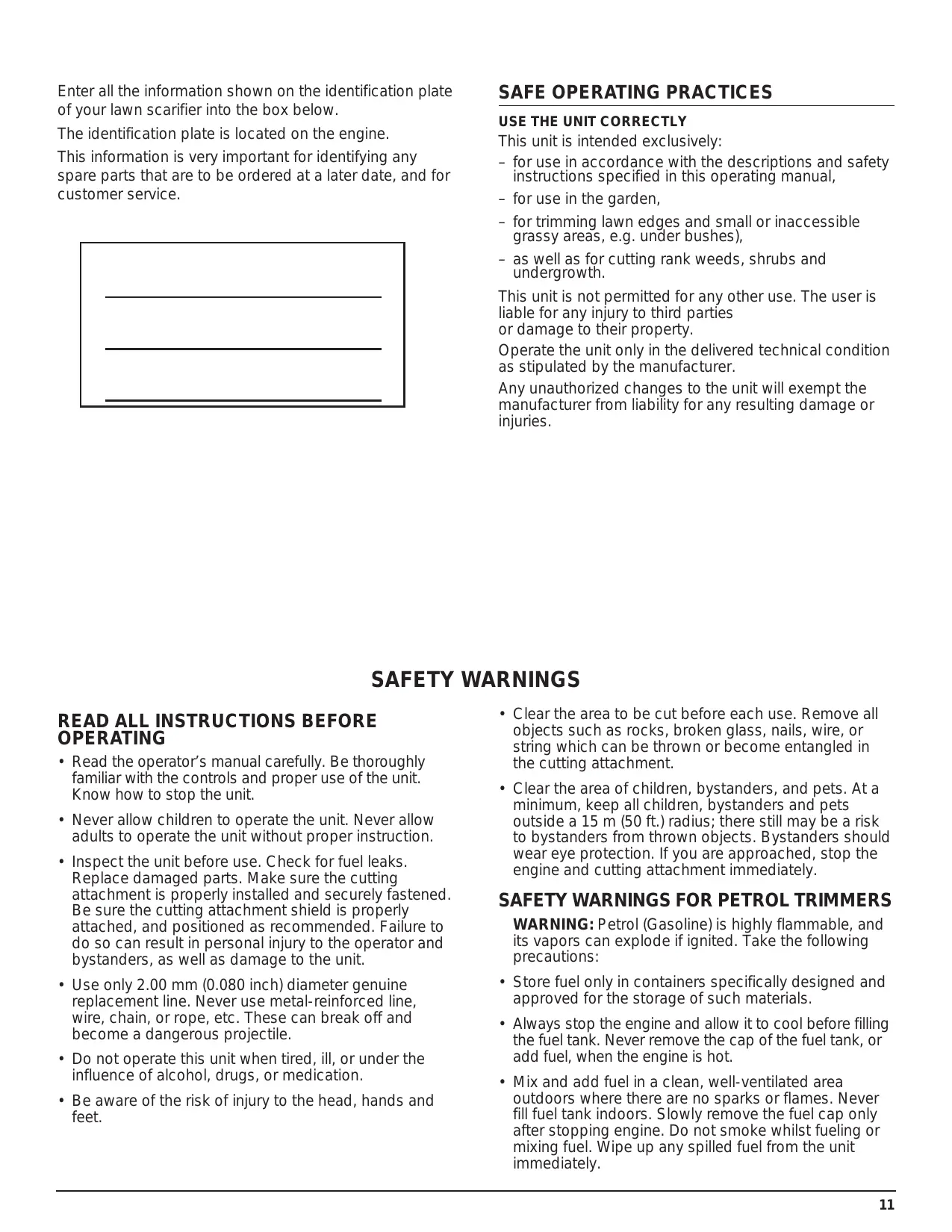 Enter all the information shown on the identification plate of your lawn scarifier into the box below. The identification plate is located on the engine. This information is very important for identifying any spare parts that are to be ordered at a later date, and for customer service.