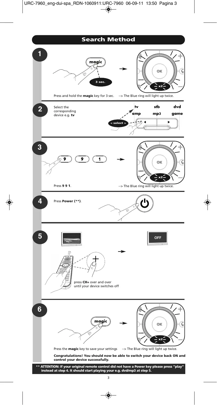 C m 2) Appuyez sur les touches 9 9 5. 3) Appuyez sur la touche assignée à la macro (par exemple, la touche “watch tv”). 4) Maintenez la touche magic enfoncée pendant 3 secondes.