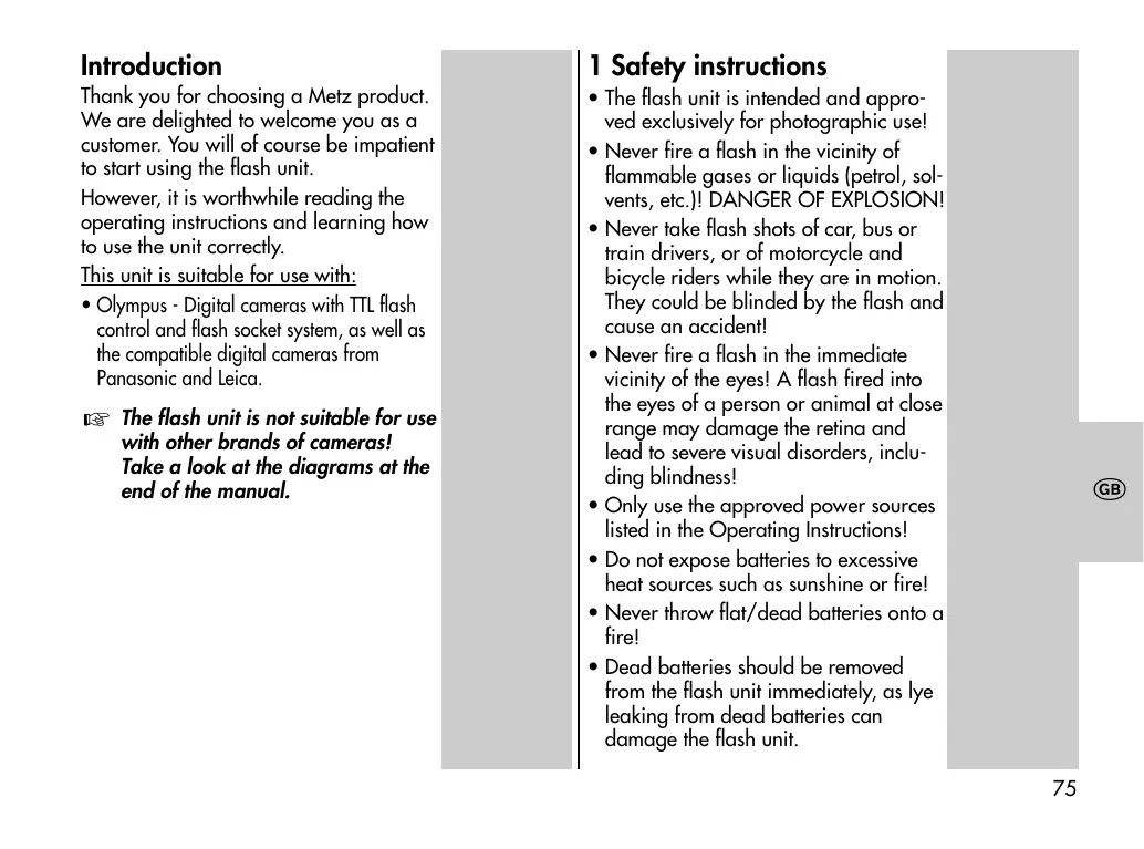 Thank you for choosing a Metz product. We are delighted to welcome you as a customer. You will of course be impatient to start using the flash unit. However, it is worthwhile reading the operating instructions and learning how to use the unit correctly. This unit is suitable for use with: