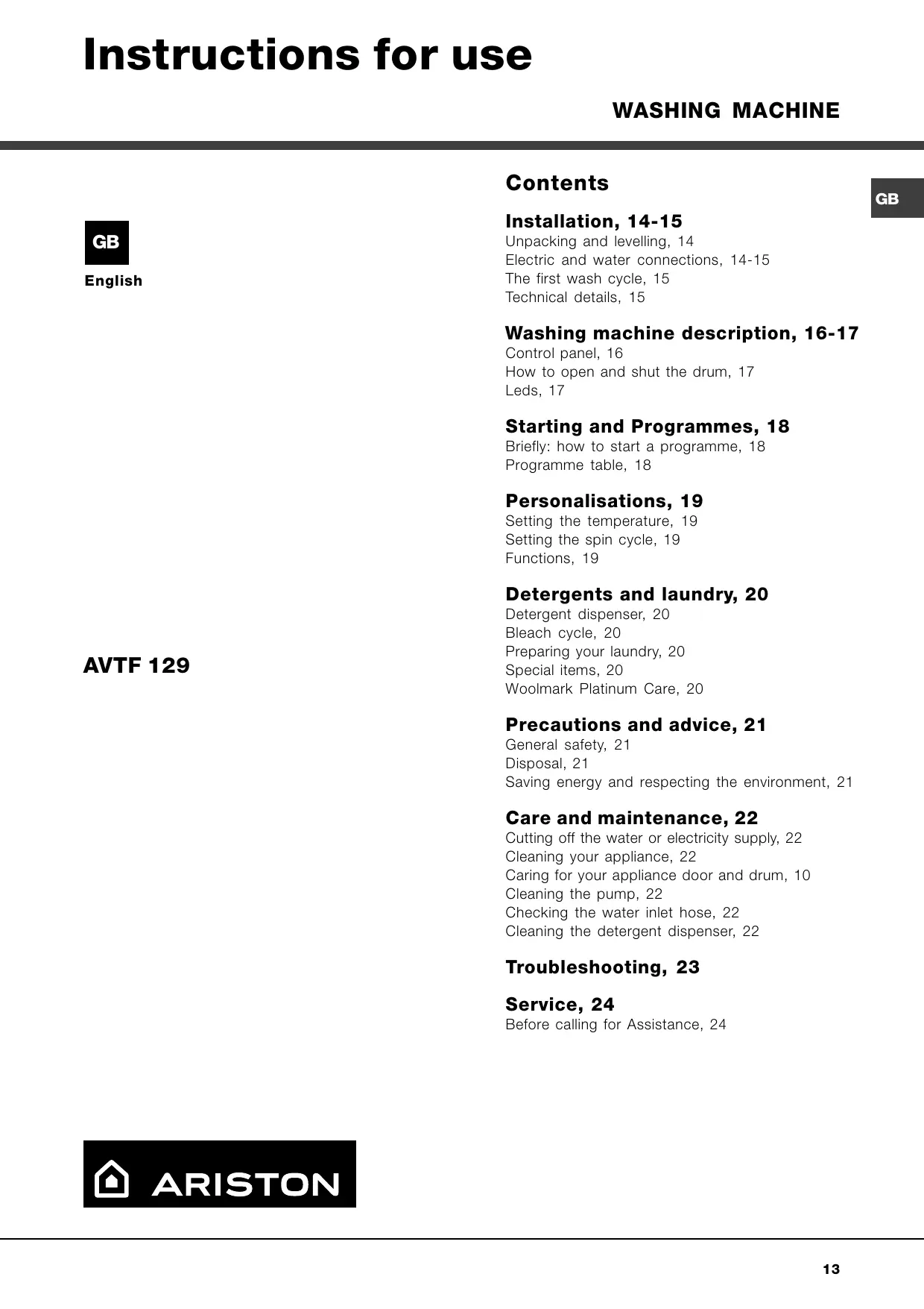 Installation, 14-15 Unpacking and levelling, 14 Electric and water connections, 14-15 The first wash cycle, 15 Technical details, 15 Washing machine description, 16-17 Control panel, 16 How to open and shut the drum, 17 Leds, 17 Starting and Programmes, 18 Briefly: how to start a programme, 18 Programme table, 18 Personalisations, 19 Setting the temperature, 19 Setting the spin cycle, 19 Functions, 19 Detergents and laundry, 20 AVTF 129 Detergent dispenser, 20 Bleach cycle, 20 Preparing your laundry, 20 Special items, 20 Woolmark Platinum Care, 20 Precautions and advice, 21 General safety, 21 Disposal, 21 Saving energy and respecting the environment, 21 Care and maintenance, 22 Cutting off the water or electricity supply, 22 Cleaning your appliance, 22 Caring for your appliance door and drum, 10 Cleaning the pump, 22 Checking the water inlet hose, 22 Cleaning the detergent dispenser, 22 Troubleshooting, 23 Service, 24 Before calling for Assistance, 24