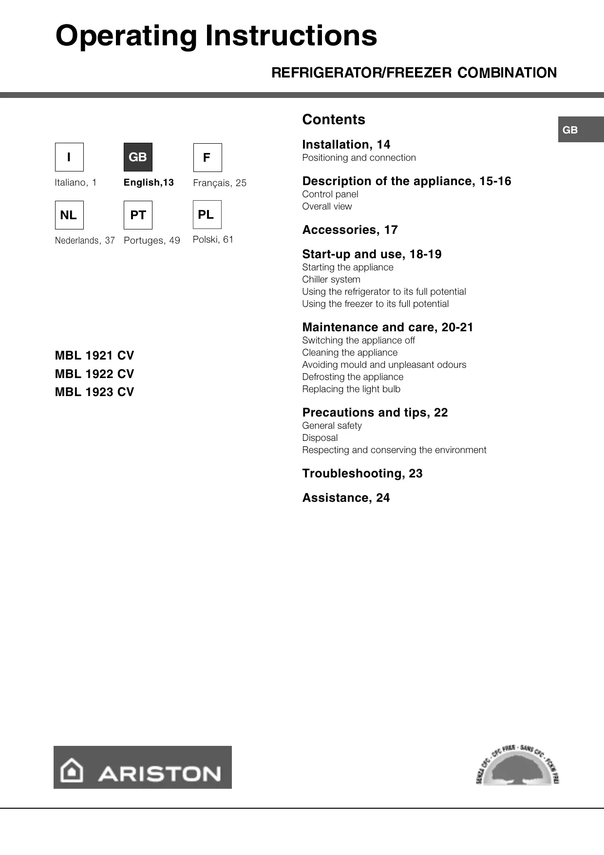 Download the instructions for your Fridge in PDF format for free! Find your manual MBL 1922 CV - HOTPOINT-ARISTON and take your electronic device back in hand. On this page are published all the documents necessary for the use of your device. MBL 1922 CV by HOTPOINT-ARISTON.