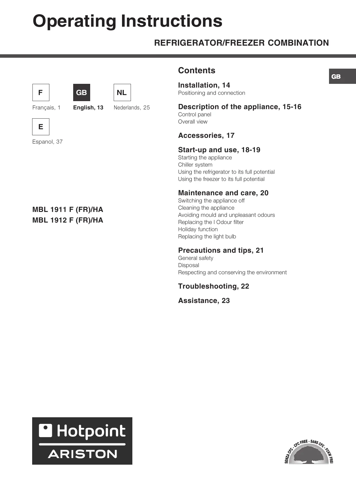 Download the instructions for your Fridge in PDF format for free! Find your manual MBL 1912 F - HOTPOINT-ARISTON and take your electronic device back in hand. On this page are published all the documents necessary for the use of your device. MBL 1912 F by HOTPOINT-ARISTON.