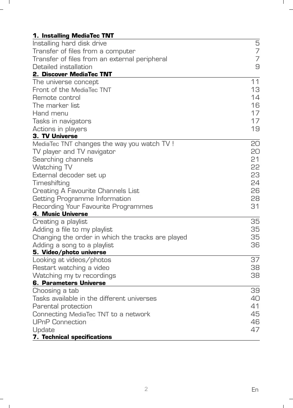 MediaTec TNT is made up of different Universes Each Universe corresponds to a separate product with its own functions and media. From the Homepage you can access all Universes: TV Universe Watch TV, organise recordings and consult the electronic programme guide. »»Go to page 20 for more details on this Universe Music Universe Listen to music and make playlists. This Universe brings together all the audio files. »»Go to page 34 for more details on this Universe Video/photo Universe Watch your TV programme recordings, create a photos slide show, watch your video camera recordings, etc. Access all image or video files in this Universe. »»Go to page 37 for more details on this Universe Parameters Universe You can modify all the MediaTec TNT settings in this Universe. »»Go to page 39 for more details on this Universe