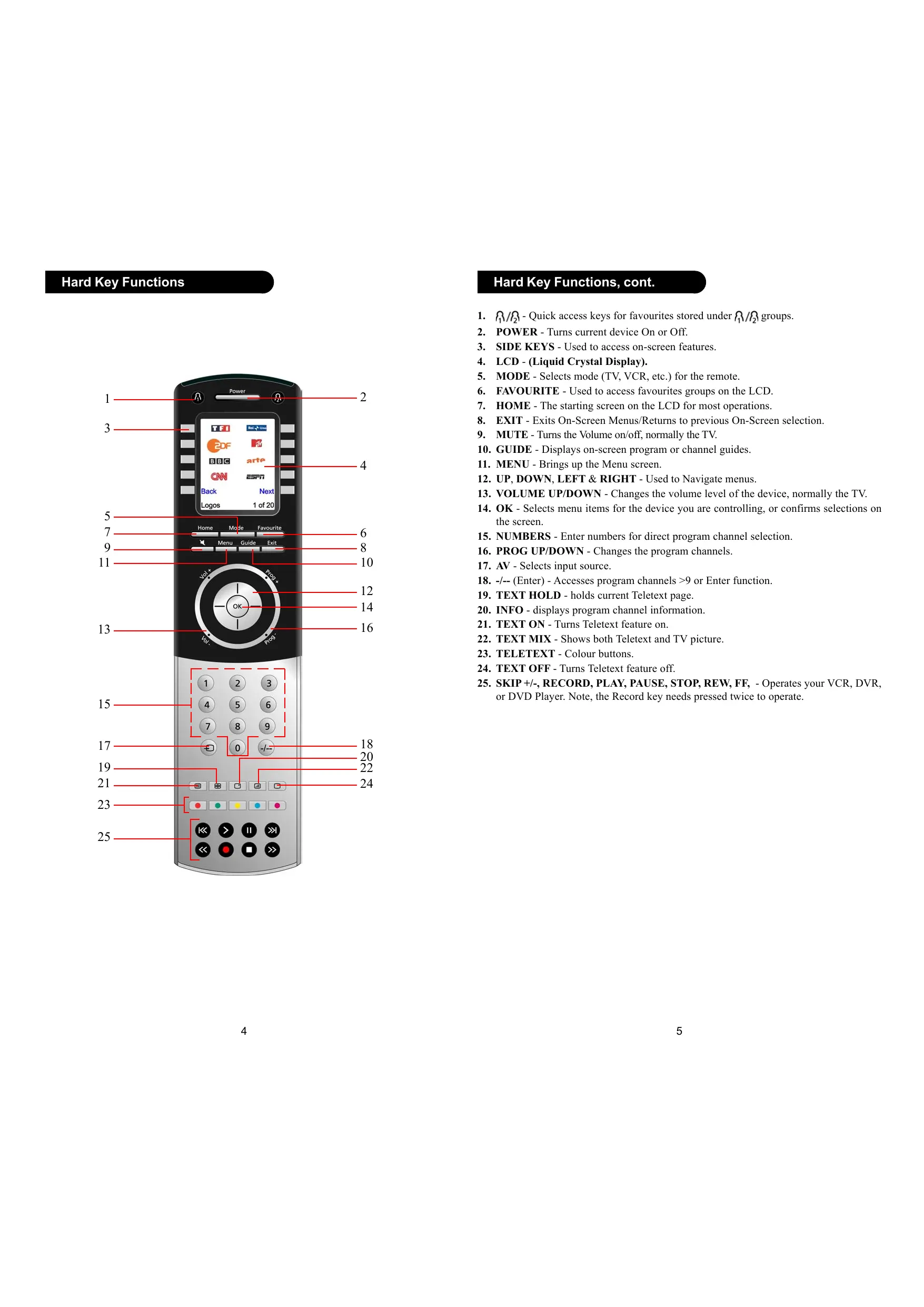 - Quick access keys for favourites stored under groups. POWER - Turns current device On or Off. SIDE KEYS - Used to access on-screen features. LCD - (Liquid Crystal Display). MODE - Selects mode (TV, VCR, etc.) for the remote. FAVOURITE - Used to access favourites groups on the LCD. HOME - The starting screen on the LCD for most operations. EXIT - Exits On-Screen Menus/Returns to previous On-Screen selection. MUTE - Turns the Volume on/off, normally the TV. GUIDE - Displays on-screen program or channel guides. MENU - Brings up the Menu screen. UP, DOWN, LEFT & RIGHT - Used to Navigate menus. VOLUME UP/DOWN - Changes the volume level of the device, normally the TV. OK - Selects menu items for the device you are controlling, or confirms selections on the screen. NUMBERS - Enter numbers for direct program channel selection. PROG UP/DOWN - Changes the program channels. AV - Selects input source. -/-- (Enter) - Accesses program channels >9 or Enter function. TEXT HOLD - holds current Teletext page. INFO - displays program channel information. TEXT ON - Turns Teletext feature on. TEXT MIX - Shows both Teletext and TV picture. TELETEXT - Colour buttons. TEXT OFF - Turns Teletext feature off. SKIP +/-, RECORD, PLAY, PAUSE, STOP, REW, FF, - Operates your VCR, DVR, or DVD Player. Note, the Record key needs pressed twice to operate.
