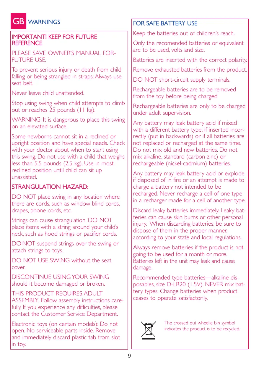 Stop using swing when child attempts to climb out or reaches 25 pounds (11 kg).