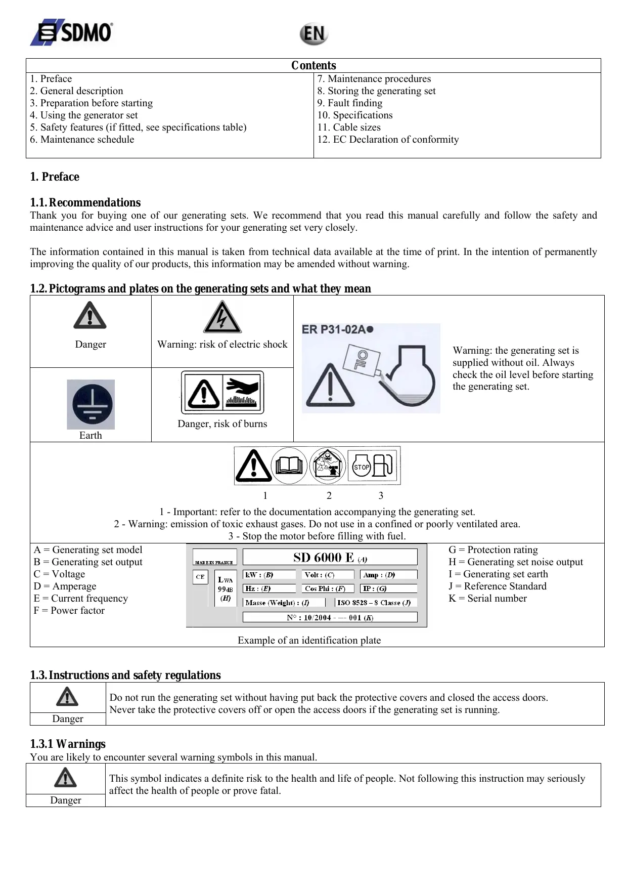 A = Generating set model G = Protection rating B = Generating set output H = Generating set noise output C = Voltage I = Generating set earth D = Amperage J = Reference Standard E = Current frequency K = Serial number F = Power factor Example of an identification plate 1.3. Instructions and safety regulations Danger Do not run the generating set without having put back the protective covers and closed the access doors. Never take the protective covers off or open the access doors if the generating set is running.