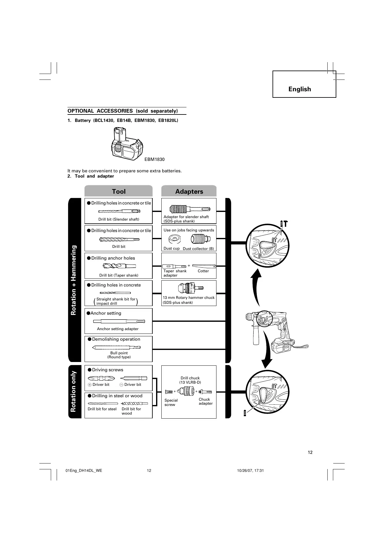 䢇Anchor setting Anchor setting adapter 䢇 Demolishing operation Rotation only Bull point (Round type) 䢇 Driving screws , Driver bit 䢇 Drilling in steel or wood Special screw Drill bit for steel
