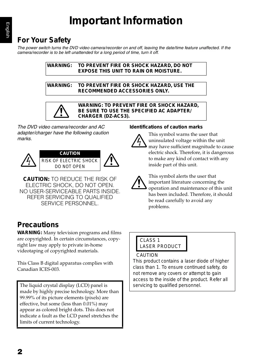 are copyrighted. In certain circumstances, copy- right law may apply to private in-home videotaping of copyrighted materials. This Class B digital apparatus complies with Canadian ICES-003. Identifications of caution marks This symbol warns the user that ÂA uninsulated voltage within the unit may have sufficient magnitude to cause electric shock. Therefore, it is dangerous to make any kind of contact with any inside part of this unit. This symbol alerts the user that A important literature concerning the operation and maintenance of this unit has been included. Therefore, it should be read carefully to avoid any problems. The liquid crystal display (LCD) panel is made by highly precise technology. More than 99.99% of its picture elements (pixels) are effective, but some (less than 0.01%) may appear as colored bright dots. This does not indicate a fault as the LCD panel stretches the limits of current technology. CLASS 1 LASER PRODUCT CAUTION This product contains a laser diode of higher class than 1. To ensure continued safety, do not remove any covers or attempt to gain access to the inside ofthe product. Refer all servicing to qualified personnel.