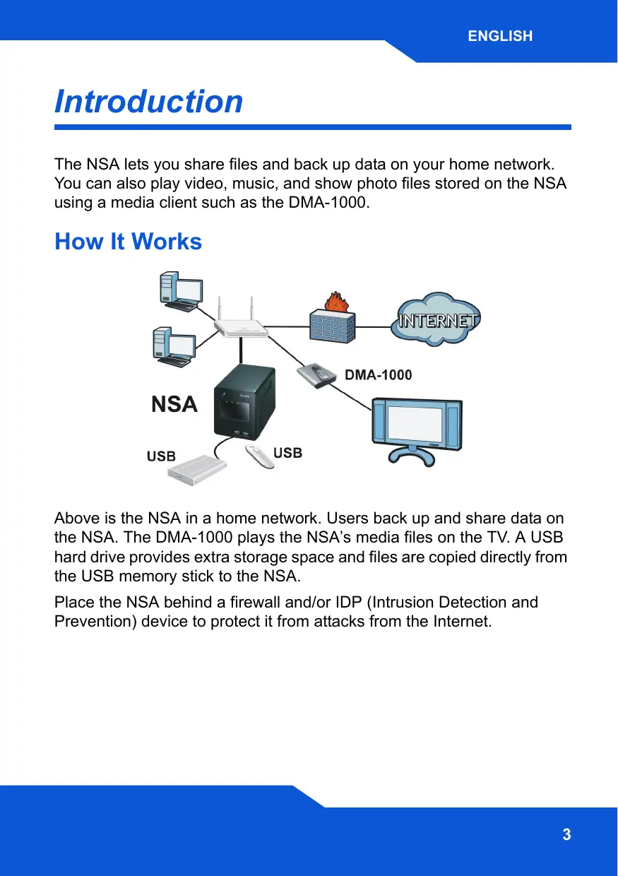Above is the NSA in a home network. Users back up and share data on the NSA. The DMA-1000 plays the NSA’s media files on the TV. A USB hard drive provides extra storage space and files are copied directly from the USB memory stick to the NSA.