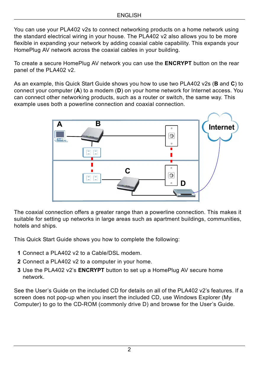 This Quick Start Guide shows you how to complete the following: 1 Connect a PLA402 v2 to a Cable/DSL modem. 2 Connect a PLA402 v2 to a computer in your home. 3 Use the PLA402 v2’s ENCRYPT button to set up a HomePlug AV secure home network. See the User’s Guide on the included CD for details on all of the PLA402 v2’s features. If a screen does not pop-up when you insert the included CD, use Windows Explorer (My Computer) to go to the CD-ROM (commonly drive D) and browse for the User’s Guide.