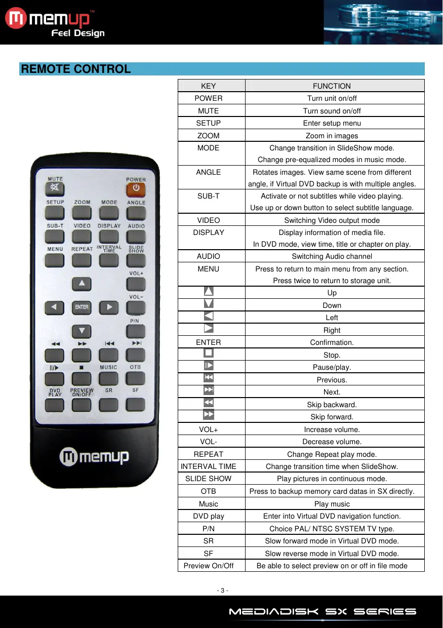 Mmem Feel Design REMOTE CONTROL z00M VIDEO FOMOFN MODE DISPLAY ANGLE AUDIO KEY FUNCTION POWER Turn unit on/oft MUTE Turn sound on/off SETUP Enter setup menu Z00M Zoom in images MODE Change transition in SlideShow mode. Change pre-equalized modes in music mode. ANGLE Rotates images. View same scene from different angle, i Virtual DVD backup is with multiple angles SUB-T Activate or not subtitles while video playing. Use up or down button to select subtitle language. VIDEO Switching Video output mode DISPLAY Display information of media file In DVD mode, view time, title or chapter on play. AUDIO Switching Audio channel MENU Press to return to main menu from any section. Press twice to return to storage unit.