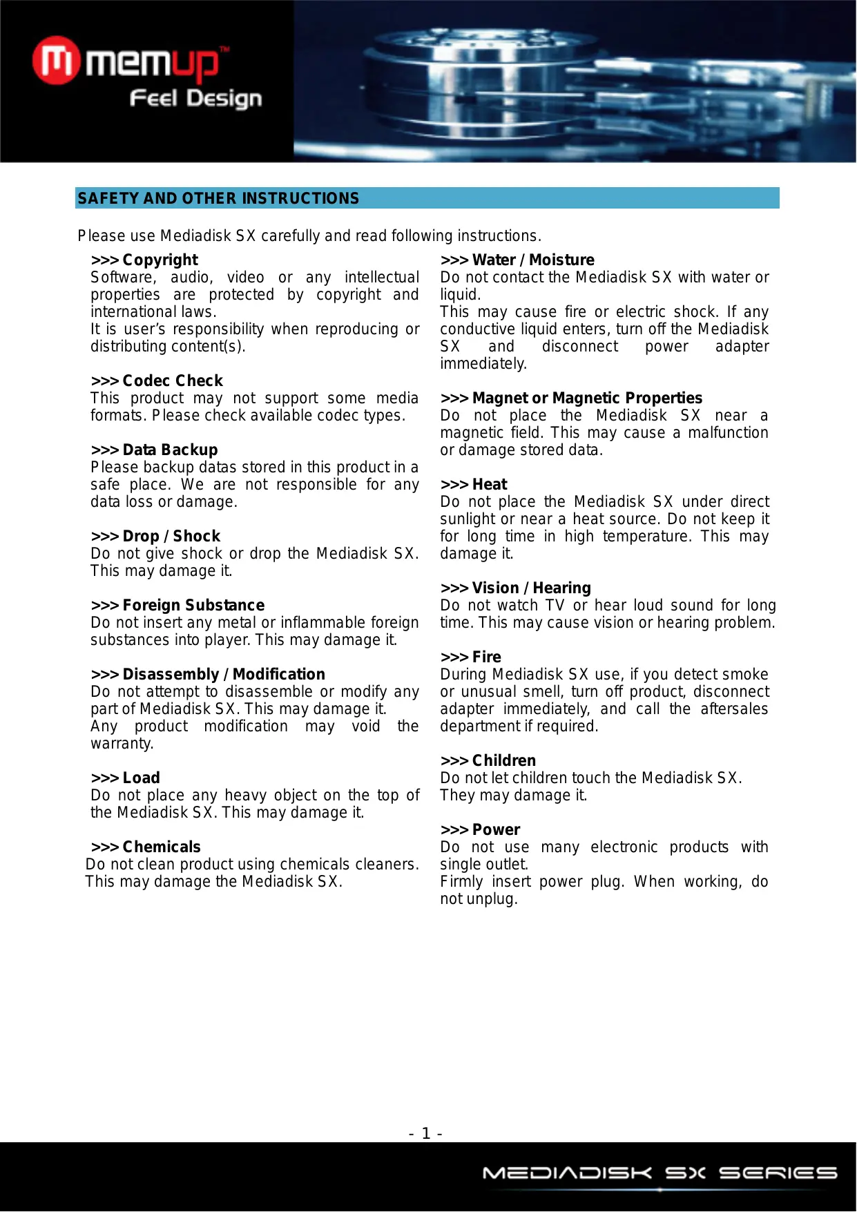 [M mem Feel Design Please use Mediadisk SX carefully and read following instructions. >>> Copyright Software, audio, video or any intellectual properties are protected by copyright and international laws. It is user's responsibility when reproducing or distributing content(s). >>> Codec Check This product may not support some media formats. Please check available codec types. >>> Data Backup Please backup datas stored in this product in a safe place. We are not responsible for any data loss or damage. >>> Drop / Shock Do not give shock or drop the Mediadisk SX. This may damage it. >>> Foreign Substance Do not insert any metal or inflammable foreign substances into player. This may damage it. >>> Disassembly / Modification Do not attempt to disassemble or modify any part of Mediadisk SX. This may damage it. Any product modification may void the warranty. >>> Load Do not place any heavy object on the top of the Mediadisk SX. This may damage it. >>> Chemicals Do not clean product using chemicals cleaners. This may damage the Mediadisk SX. >>> Water / Moisture Do not contact the Mediadisk SX with water or liquid. This may cause fire or electric shock. If any conductive liquid enters, turn off the Mediadisk SX and disconnect power adapter immediately. >>> Magnet or Magnetic Properties Do not place the Mediadisk SX near a magnetic field. This may cause a malfunction or damage stored data. >>> Heat Do not place the Mediadisk SX under direct sunlight or near a heat source. Do not keep it for long time in high temperature. This may damage it. >>> Vision / Hearing Do not watch TV or hear loud sound for long time. This may cause vision or hearing problem. >>> Fire During Mediadisk SX use, if you detect smoke or unusual smell, turn off product, disconnect adapter immediately, and call the aftersales department if required. >>> Children Do not let children touch the Mediadisk SX. They may damage it. >>> Power Do not use many electronic products with single outlet. Firmly insert power plug. When working, do not unplug.