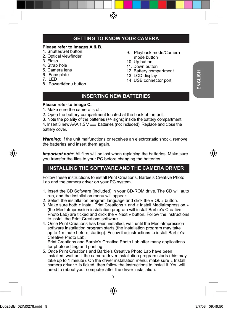 the batteries and insert them again. Important note: All files will be lost when replacing the batteries. Make sure you transfer the files to your PC before changing the batteries. INSTALLING THE SOFTWARE AND THE CAMERA DRIVER Follow these instructions to install Print Creations, Barbie’s Creative Photo Lab and the camera driver on your PC system.