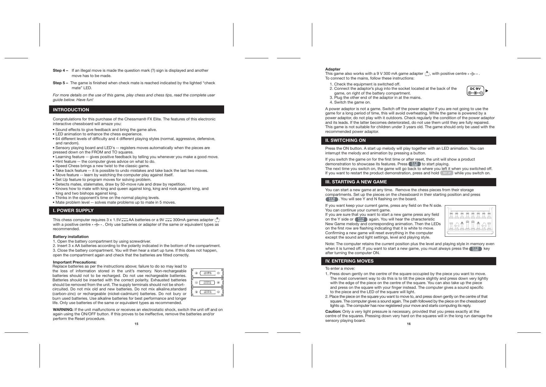 I. POWER SUPPLY This chess computer requires 3 x 1.5V AA batteries or a 9V