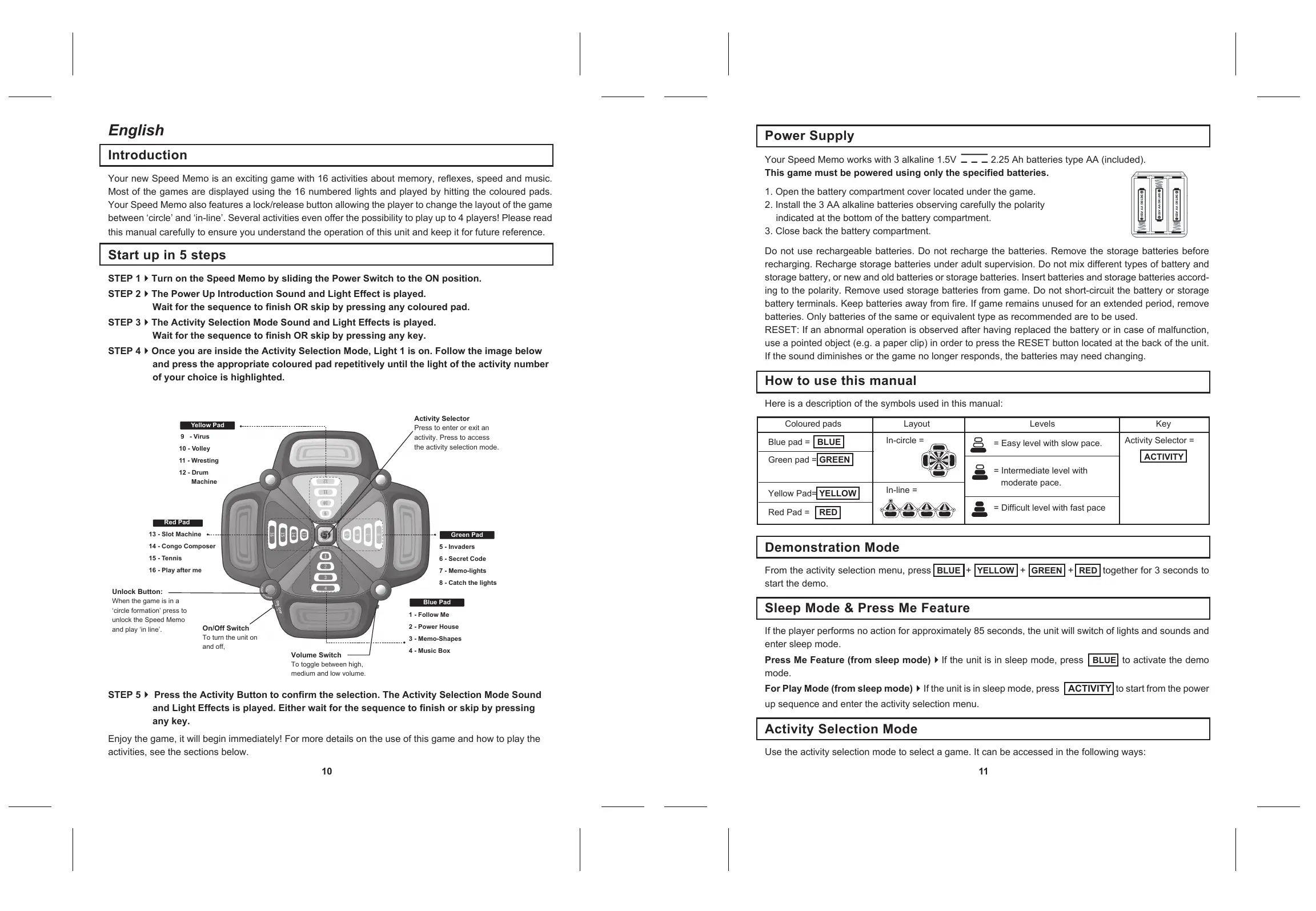 Your new Speed Memo is an exciting game with 16 activities about memory, reflexes, speed and music. Most of the games are displayed using the 16 numbered lights and played by hitting the coloured pads. Your Speed Memo also features a lock/release button allowing the player to change the layout of the game between 'circle' and 'in-line'. Several activities even offer the possibility to play up to 4 players! Please read this manual carefully to ensure you understand the operation of this unit and keep it for future reference.