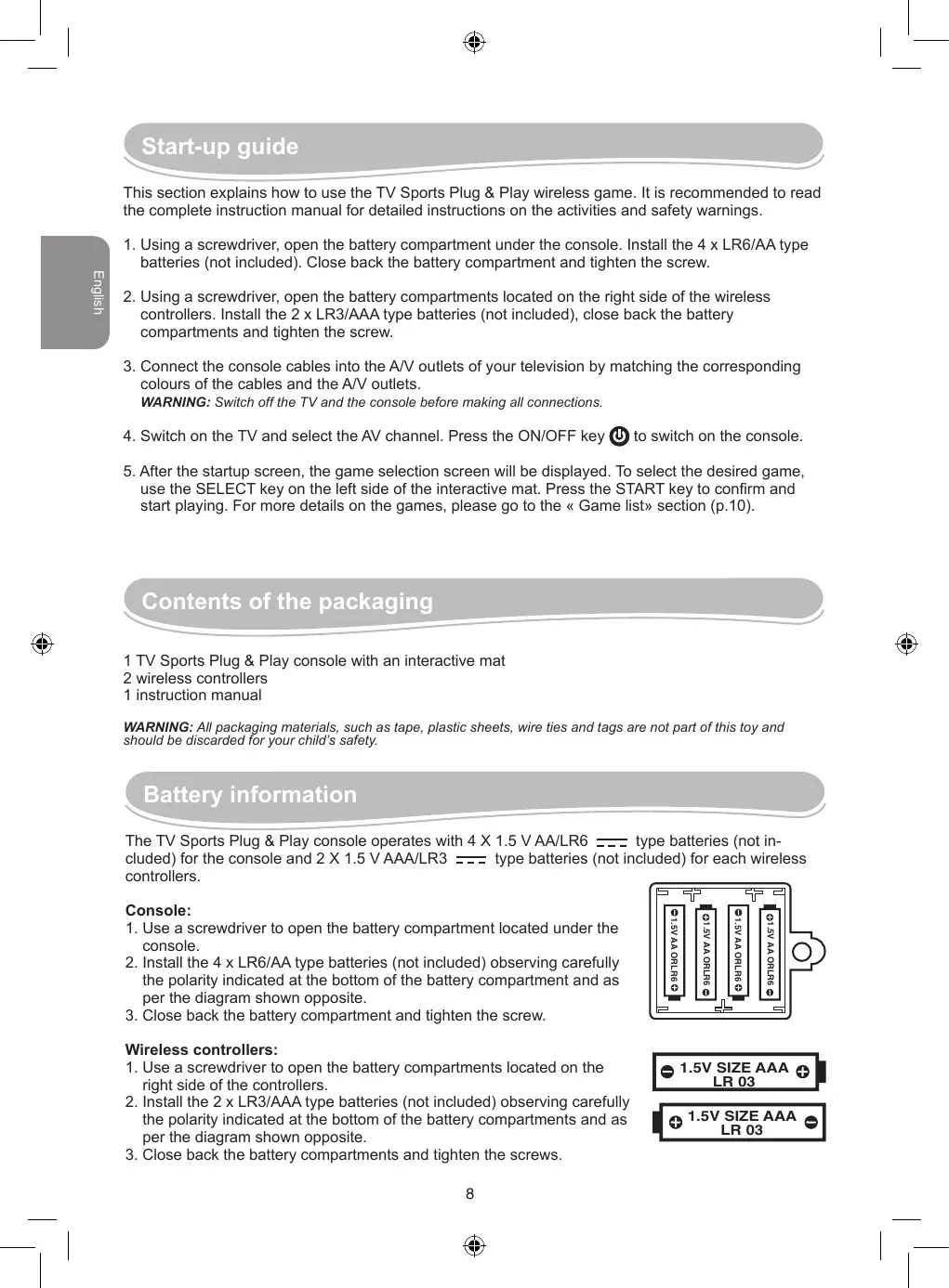 should be discarded for your child’s safety. Battery information The TV Sports Plug & Play console operates with 4 X 1.5 V AA/LR6 type batteries (not included) for the console and 2 X 1.5 V AAA/LR3 type batteries (not included) for each wireless controllers.