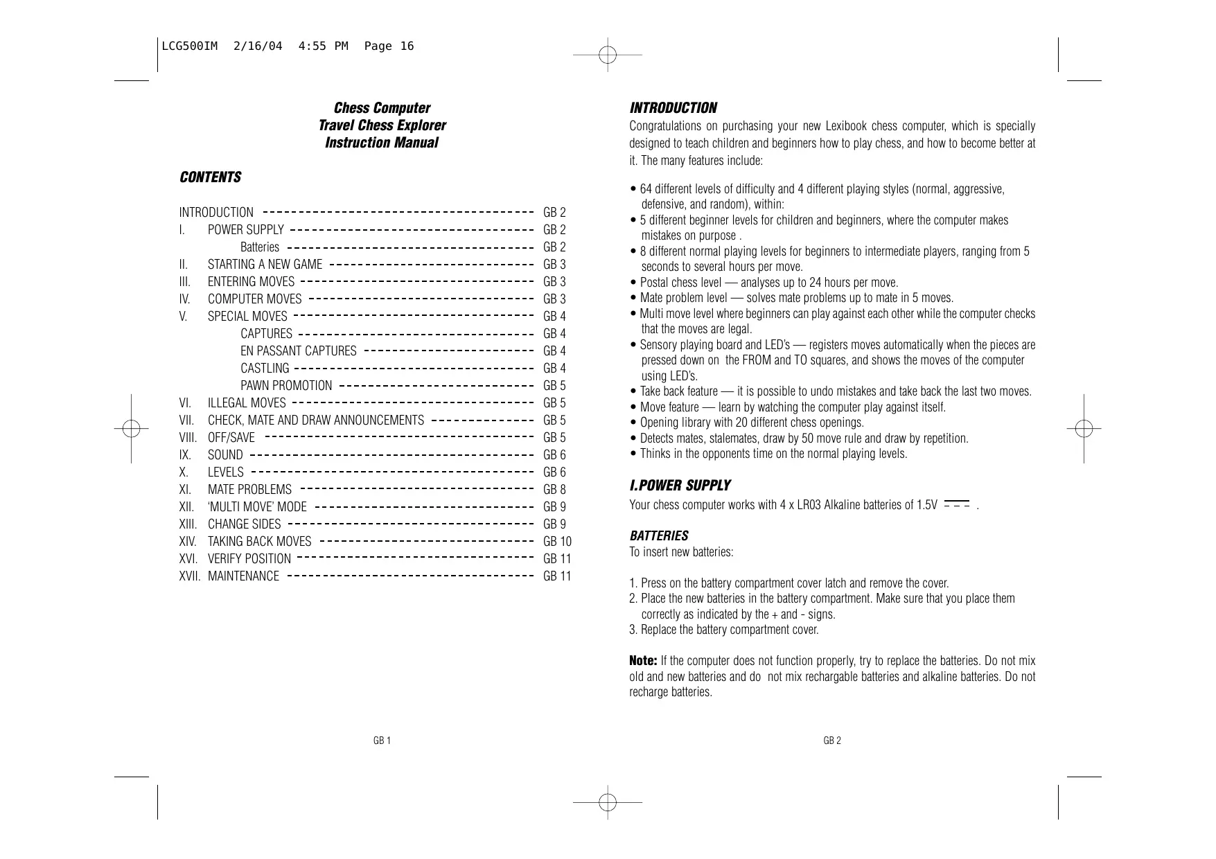 I.POWER SUPPLY Your chess computer works with 4 x LR03 Alkaline batteries of 1.5V