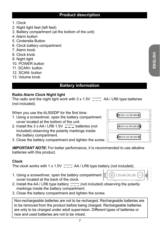 Battery information Radio Alarm Clock Night light The radio and the night light work with 3 x 1.5V (not included). AA / LR6 type batteries When you use the AL500DP for the first time: