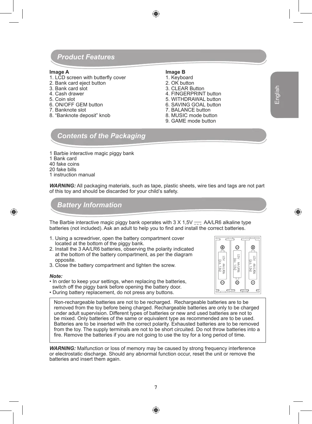 of this toy and should be discarded for your child’s safety. Battery Information The Barbie interactive magic piggy bank operates with 3 X 1,5V AA/LR6 alkaline type batteries (not included). Ask an adult to help you to find and install the correct batteries.