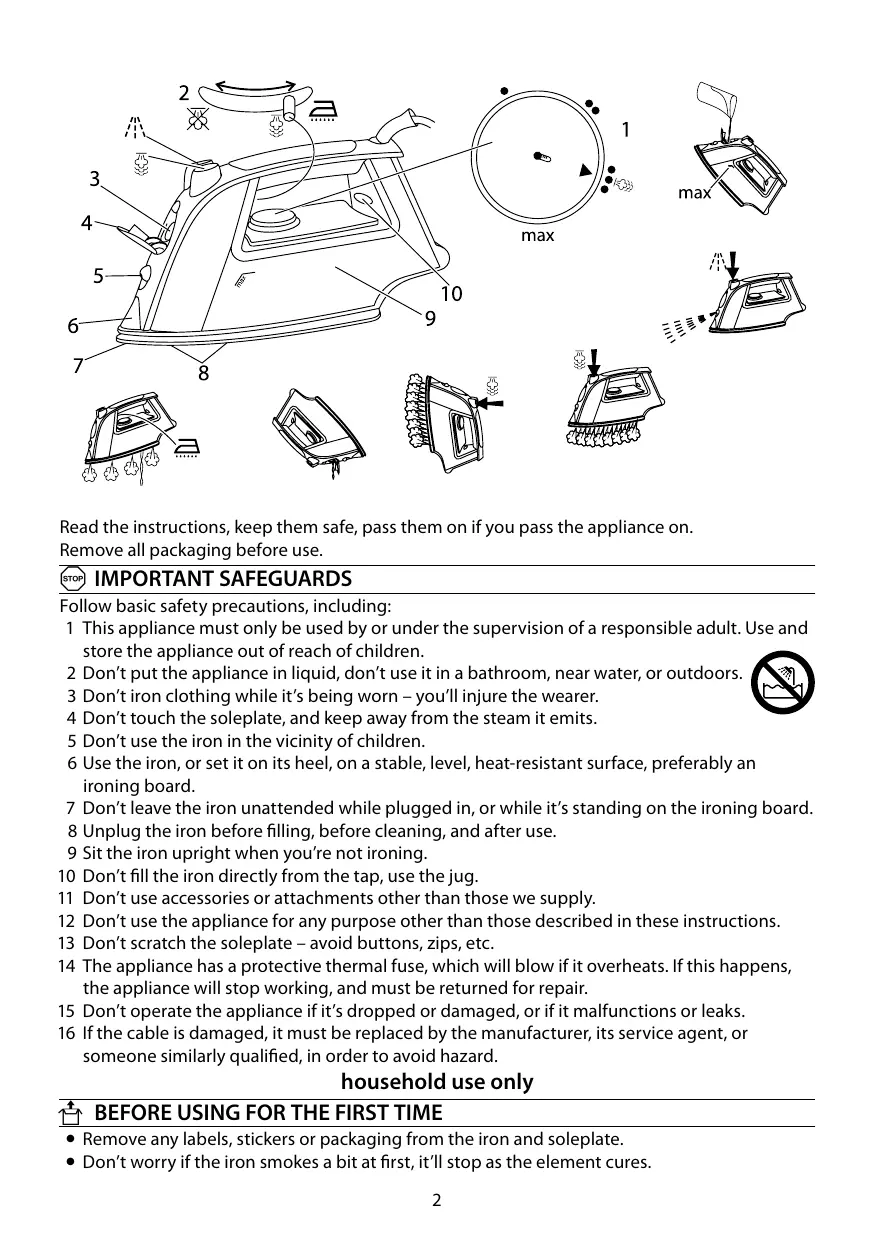 1 This appliance must only be used by or under the supervision of a responsible adult. Use and store the appliance out of reach of children. 2 Don’t put the appliance in liquid, don’t use it in a bathroom, near water, or outdoors. 3 Don’t iron clothing while it’s being worn – you’ll injure the wearer. 4 Don’t touch the soleplate, and keep away from the steam it emits. 5 Don’t use the iron in the vicinity of children. 6 Use the iron, or set it on its heel, on a stable, level, heat-resistant surface, preferably an ironing board. 7 Don’t leave the iron unattended while plugged in, or while it’s standing on the ironing board. 8 Unplug the iron before filling, before cleaning, and after use. 9 Sit the iron upright when you’re not ironing. 10 Don’t fill the iron directly from the tap, use the jug. 11 Don’t use accessories or attachments other than those we supply. 12 Don’t use the appliance for any purpose other than those described in these instructions. 13 Don’t scratch the soleplate – avoid buttons, zips, etc. 14 The appliance has a protective thermal fuse, which will blow if it overheats. If this happens, the appliance will stop working, and must be returned for repair. 15 Don’t operate the appliance if it’s dropped or damaged, or if it malfunctions or leaks. 16 If the cable is damaged, it must be replaced by the manufacturer, its service agent, or someone similarly qualified, in order to avoid hazard.