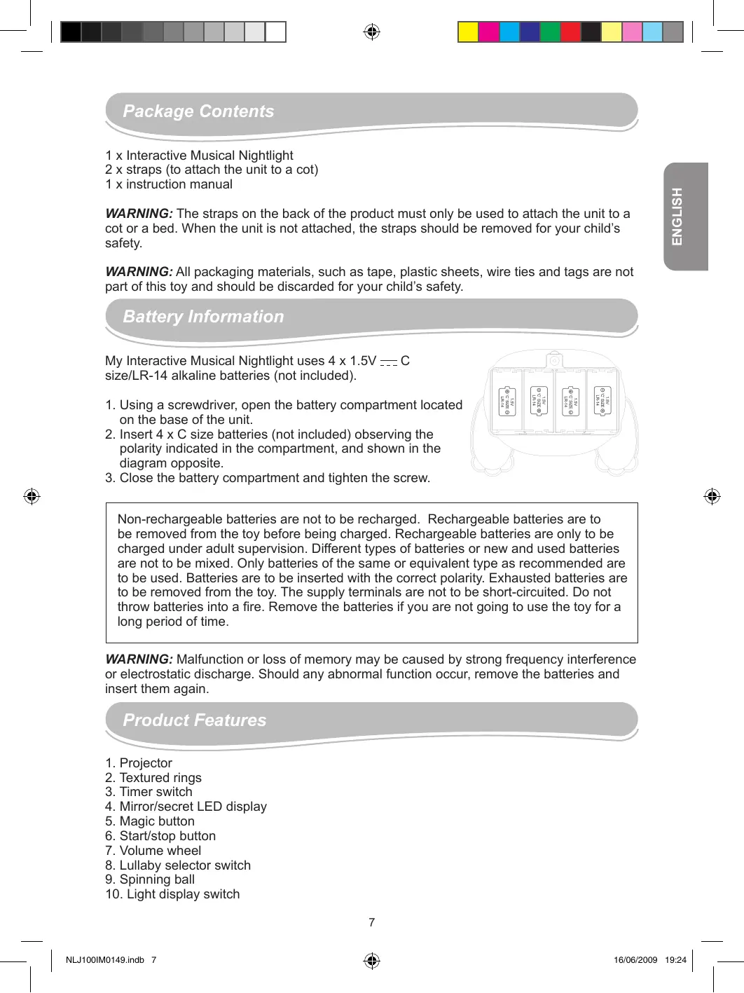 1 x Interactive Musical Nightlight 2 x straps (to attach the unit to a cot) 1 x instruction manual WARNING: The straps on the back of the product must only be used to attach the unit to a cot or a bed. When the unit is not attached, the straps should be removed for your child’s safety.