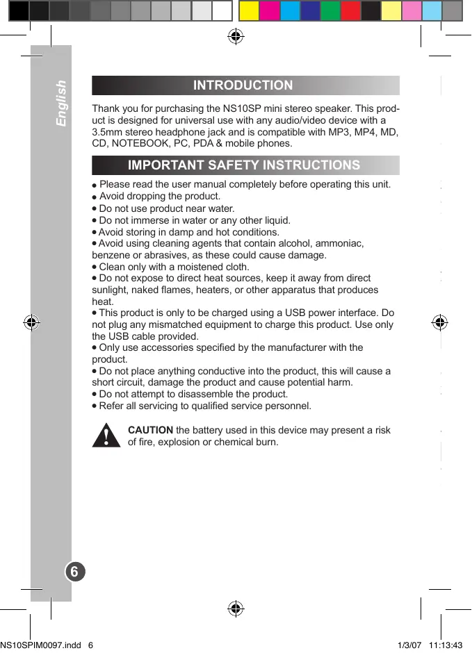 INTRODUCTION Thank you for purchasing the NS10SP mini stereo speaker. This product is designed for universal use with any audio/video device with a 3.5mm stereo headphone jack and is compatible with MP3, MP4, MD, CD, NOTEBOOK, PC, PDA & mobile phones.