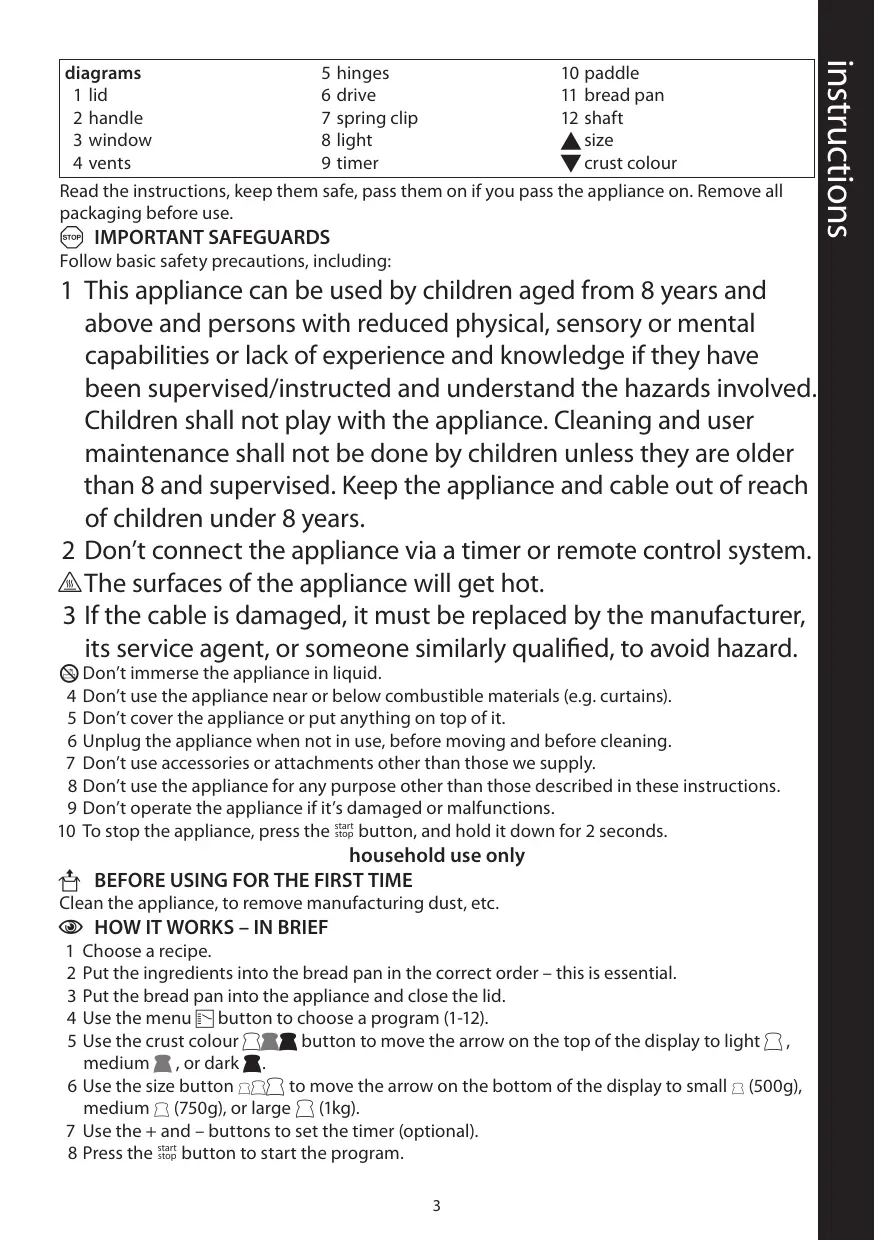 5 hinges 10 paddle 1 lid 6 drive 11 bread pan 2 handle 7 spring clip 12 shaft 3 window 8 light u size 4 vents 9 timer d crust colour Read the instructions, keep them safe, pass them on if you pass the appliance on. Remove all packaging before use.