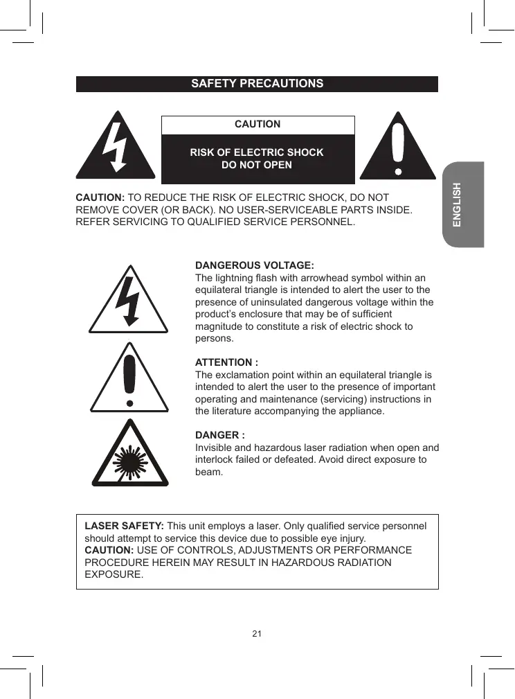 SAFETY PRECAUTIONS CAUTION ENGLISH RISK OF ELECTRIC SHOCK DO NOT OPEN CAUTION: TO REDUCE THE RISK OF ELECTRIC SHOCK, DO NOT REMOVE COVER (OR BACK). NO USER-SERVICEABLE PARTS INSIDE.