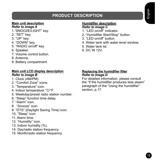Replacing the humidifier filter Refer to image D For detailed information, please consult the “If the humidifier produces less steam” paragraph of the “Using the humidifier” section, p.17. English PRODUCT DESCRIPTION Main unit description Refer to image A 1.“SNOOZE/LIGHT” key.