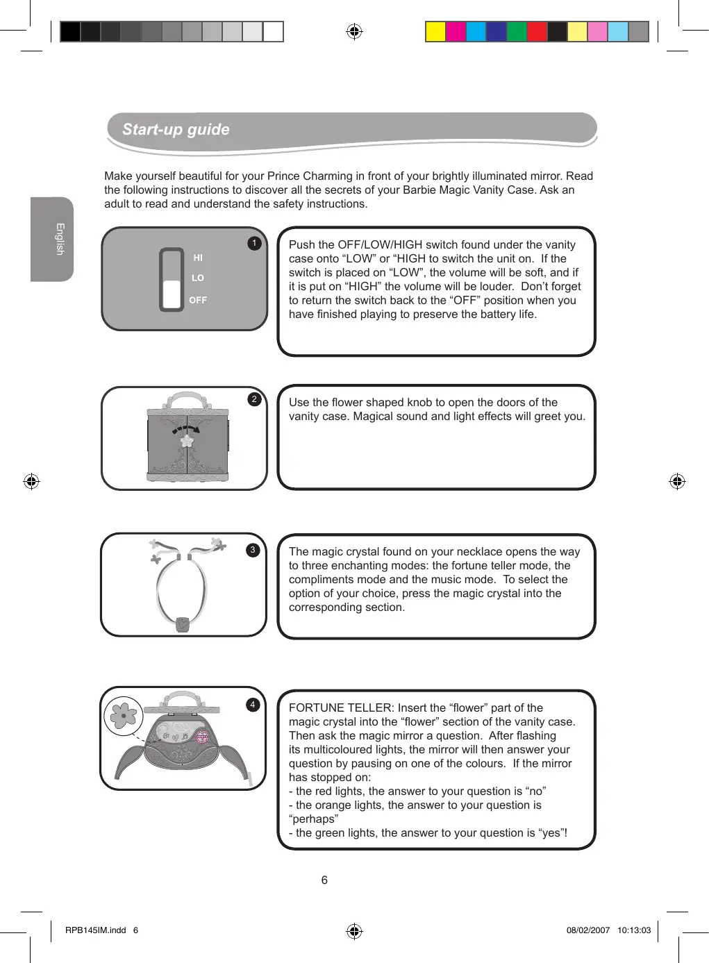 Start-up guide Make yourself beautiful for your Prince Charming in front of your brightly illuminated mirror. Read the following instructions to discover all the secrets of your Barbie Magic Vanity Case. Ask an adult to read and understand the safety instructions. English