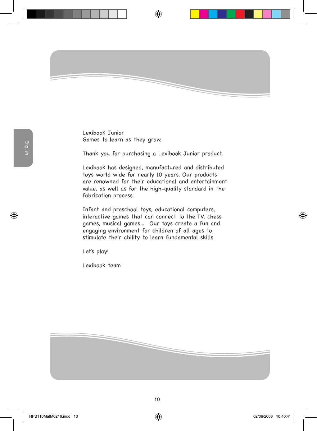 Lexibook Junior Games to learn as they grow, Thank you for purchasing a Lexibook Junior product. Lexibook has designed, manufactured and distributed toys world wide for nearly 10 years. Our products are renowned for their educational and entertainment value, as well as for the high-quality standard in the fabrication process. Infant and preschool toys, educational computers, interactive games that can connect to the TV, chess games, musical games… Our toys create a fun and engaging environment for children of all ages to stimulate their ability to learn fundamental skills. Let’s play! Lexibook team