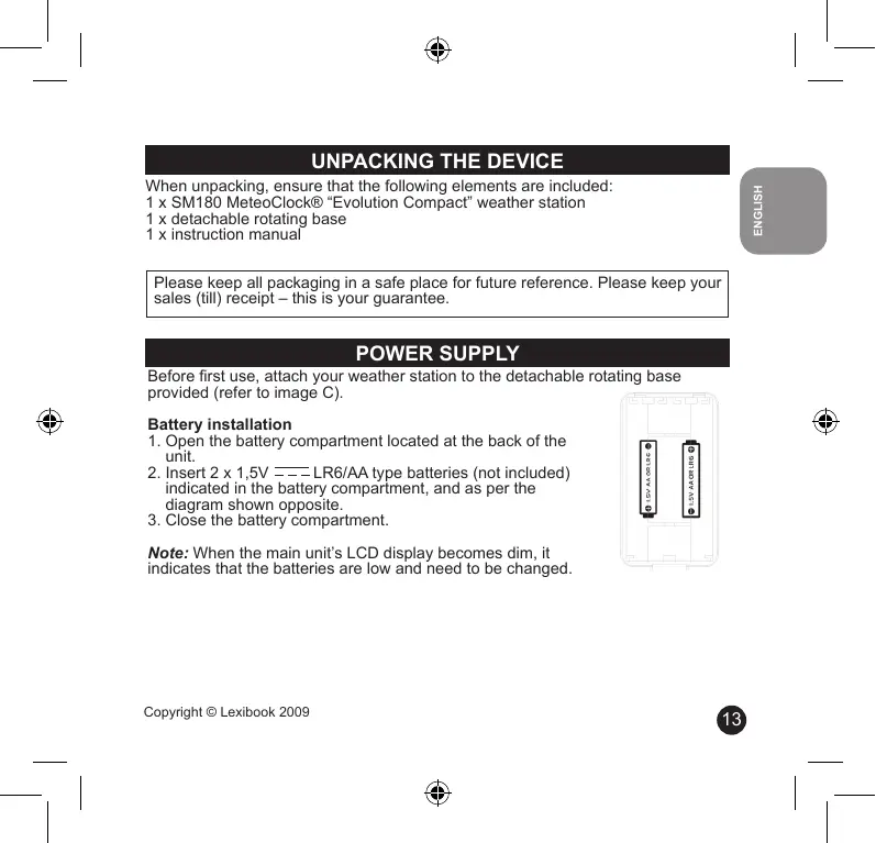 ENGLISH When unpacking, ensure that the following elements are included: 1 x SM180 MeteoClock® “Evolution Compact” weather station 1 x detachable rotating base 1 x instruction manual Please keep all packaging in a safe place for future reference. Please keep your sales (till) receipt – this is your guarantee. POWER SUPPLY Before first use, attach your weather station to the detachable rotating base provided (refer to image C). Battery installation