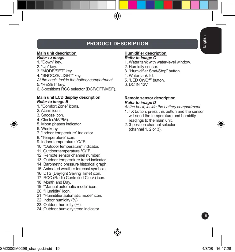 (display of all the readings), press and hold the key for 2 or 3 seconds to synchronize manually the remote sensor and the main unit. Note: it may take up to 1 minute before the main unit displays the readings. Radio Control Clock (RCC) After the main unit and the remote sensor have been synchronized, the SM2000 will automatically activate the RCC function. Your weather station is designed to automatically synchronize its calendar clock once it is brought within the reception range of a radio signal. There are 2 different radio signals: - DCF77 signal, for GMT +1 (France, Spain, Italy, Germany); - MSF signal, for GMT (UK, Ireland, Portugal). The DCF77 signal will be received if the main unit is within 1500 km of the Frankfurt atomic clock. Your main unit will be automatically synchronised with the MSF signal if located within the UK radio signal range.