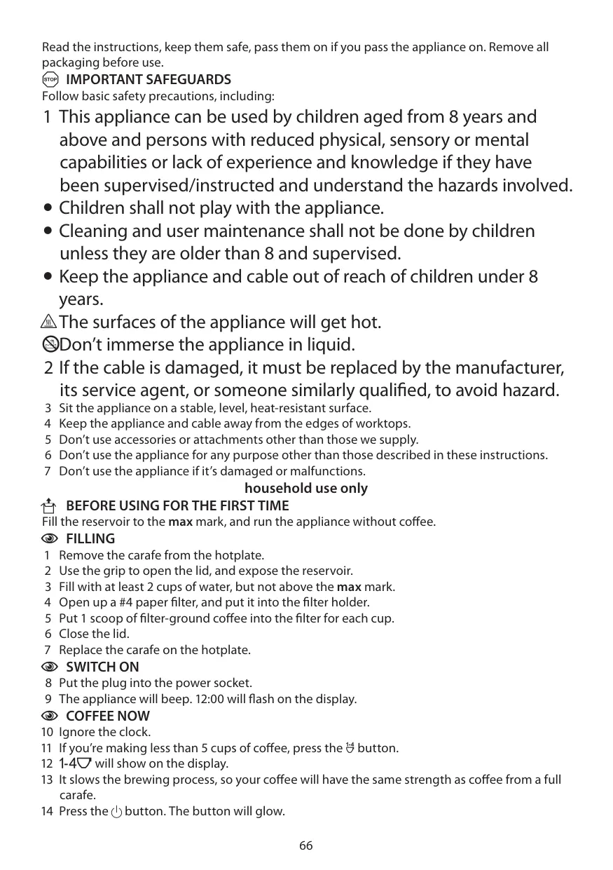 5 filter holder 9 hotplate 1 grip 6 paper filter #4 10 status light 2 lid (not supplied) 11 scoop 3 water 7 press ¬ dishwasher – top rack 4 slot 8 carafe 15 Shortly afterwards, coffee will start to drip into the carafe. 16 When it’s done, the hotplate will keep the carafe warm. The appliance will beep. 17 If you want to stop the coffee maker while it’s brewing, press the 2 button.