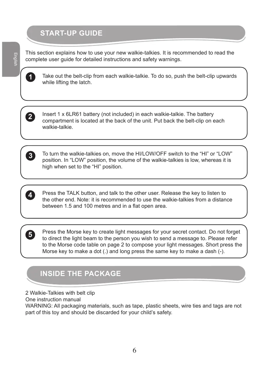 START-UP GUIDE English This section explains how to use your new walkie-talkies. It is recommended to read the complete user guide for detailed instructions and safety warnings.